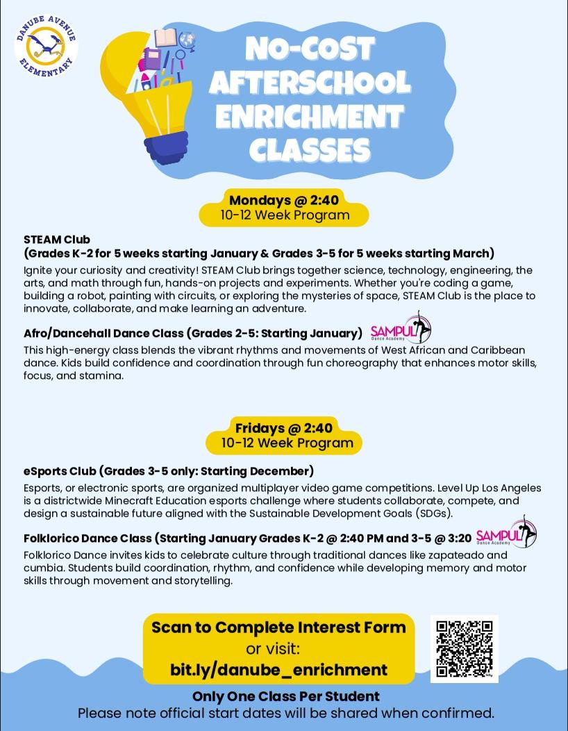 We’re excited to introduce new no-cost Afterschool Enrichment Classes for Danube students! These 10-12 week programs, held on either Mondays or Fridays from 2:45 to 3:45 PM, offer fun and creative opportunities for students to explore their interests.